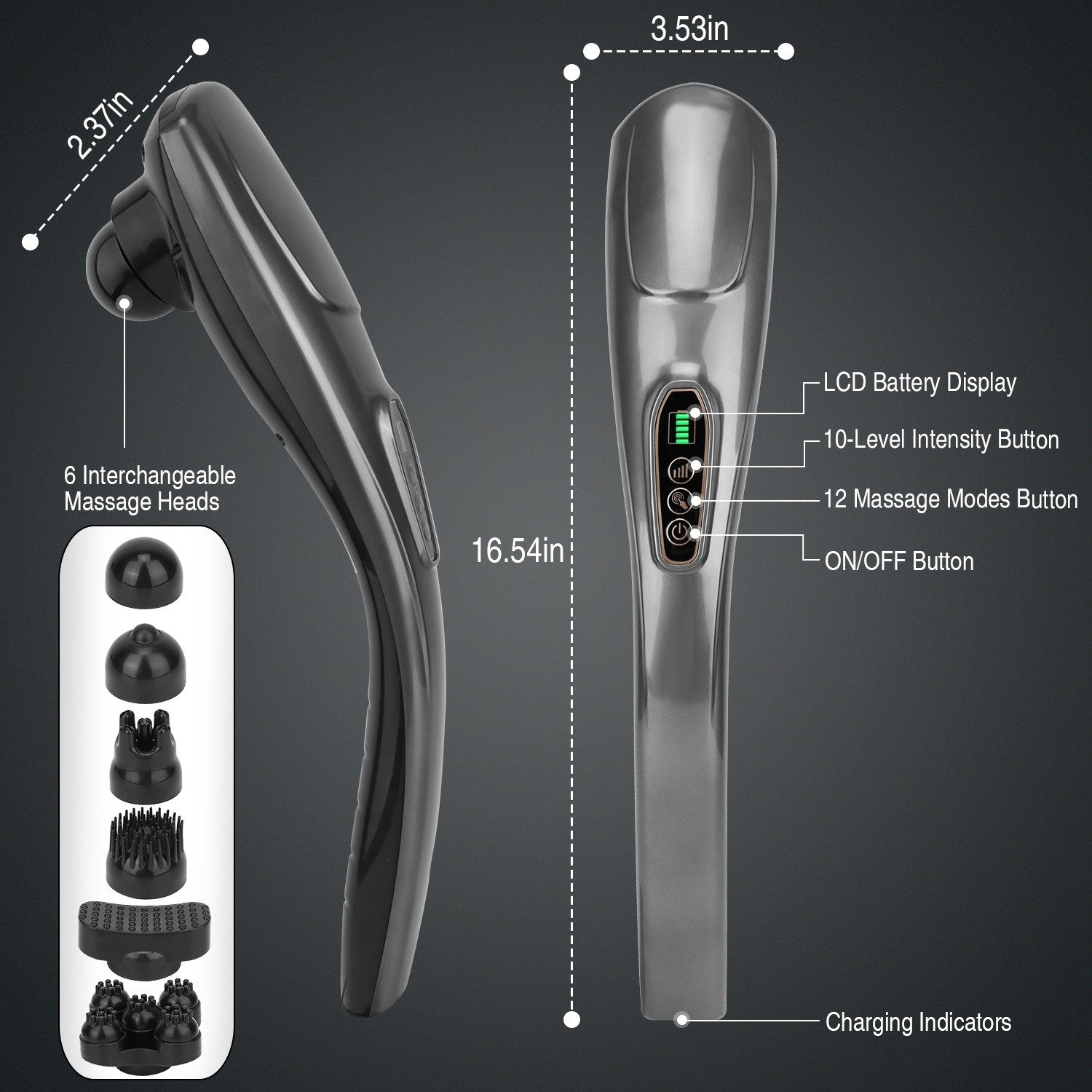 **6 INTERCHANGEABLE MASSAGE HEADS*:Switch among 6 massage heads of different shapes,well promoting stress relief with full body massage on body parts,such as back,foot,arm,muscle,leg,calf,neck,shoulder,elbow,thigh,also has proven to improve blood circulation.