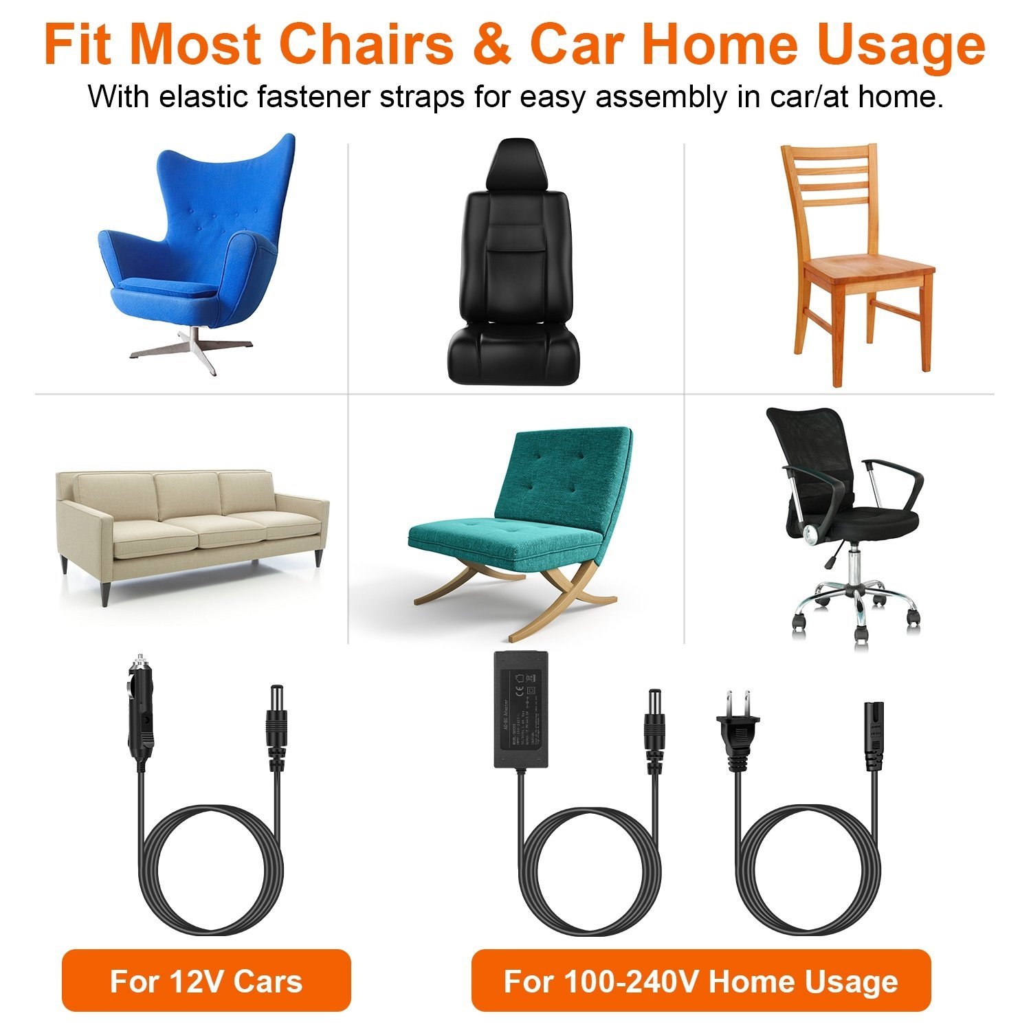 *Home & Car Usage*:Comes with an adapter,a US plug cable and a 12V cigarette lighter cable,you can assemble the massager to your car seat chair or home chair like sofa,couch,recliner,etc. with two elastic fastener straps.